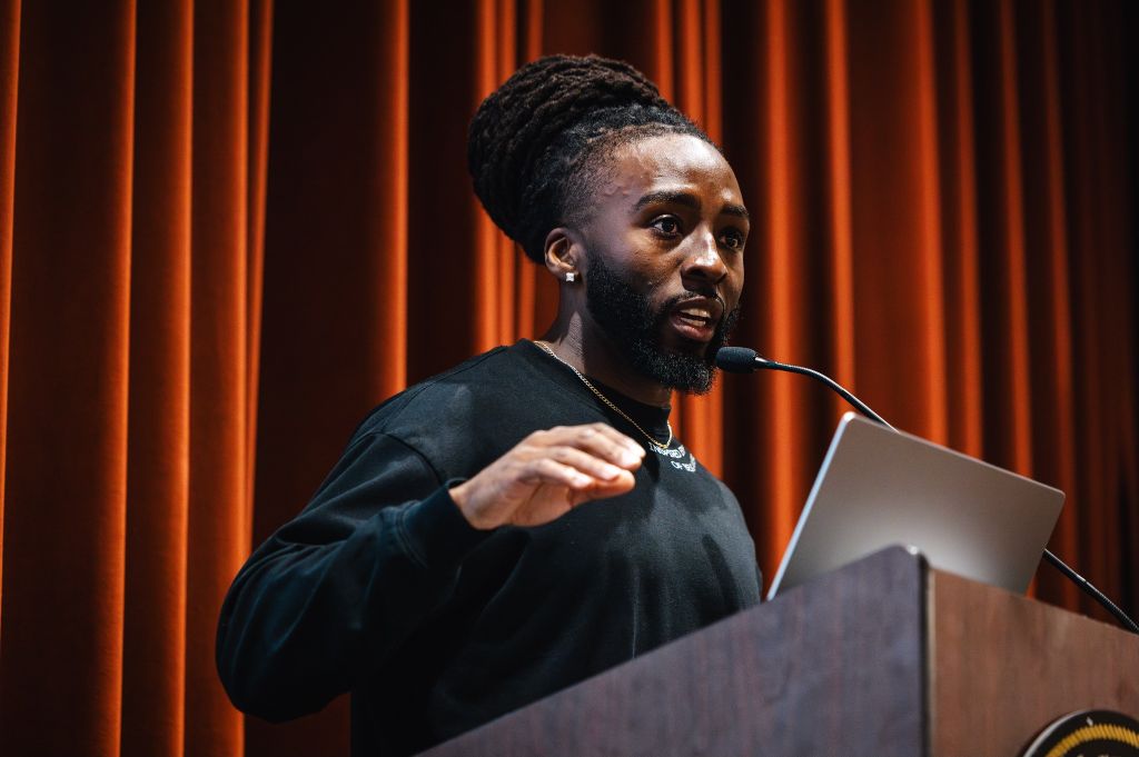 AIC alumnus Devonte Dillion delivers a keynote speech during New Student Orientation on August 29 in the College's Griswold Theatre (photo by Leon Nguyen/AIC)